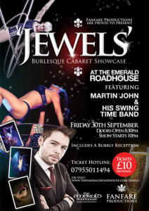 Jewels Showcaseby Kittyin Newson Posted on September 11, 2011August 22, 2012 On Friday 30th September, Fanfare productions will be presenting Jewel’s Burlesque Cabaret Show in The Emerald Roadhouse. Featuring Martin John and his swing time band, this is a night not to be missed! Click on the link below for more information.